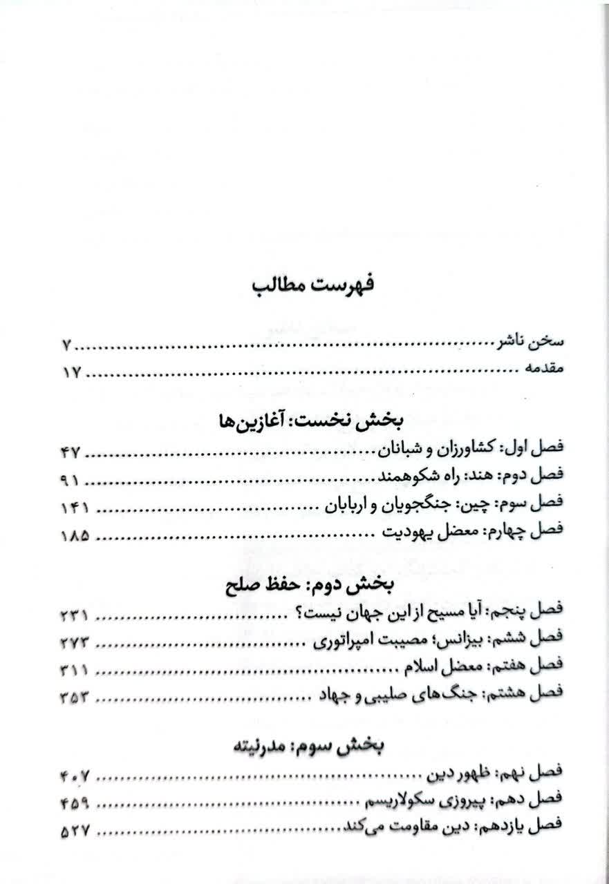 مؤلف در این سفر تاریخی، از تحولات مفهوم «دین» در دوران معاصر پرده برمی دارد و معتقد است دین پیش از سدۀ هجدهم مفهومی جدا از دیگر شؤون زندگی بشری نبود. مردم در آن زمان خدا را به طریقی فردی تجربه نمی کردند. تجربۀ خدا، با زیستن با مفهوم خدا در بستر جامعه و با عمل خلاقانه و محبتآمیز رخ می داد. دین در تمدنهای ماقبل مدرنیته نوعی مواجهه شخصی میان خدا و انسان نبود و در همۀ فعالیتهای انسان جریان داشت. هر قرائتی از تاریخِ گذشته با نگرش سکولارِ امروزی که بر جدایی مفهومی میان آنچه دینی و آنچه سیاسی است تکیه دارد قرائتی اشتباه است و بر تناقضی غیر تاریخی بنا شده است. «دین» در دوران معاصر پرده برمی دارد و معتقد است دین پیش از سدۀ هجدهم مفهومی جدا از دیگر شؤون زندگی بشری نبود. مردم در آن زمان خدا را به طریقی فردی تجربه نمی کردند. تجربۀ خدا، با زیستن با مفهوم خدا در بستر جامعه و با عمل خلاقانه و محبتآمیز رخ می داد. دین در تمدنهای ماقبل مدرنیته نوعی مواجهه شخصی میان خدا و انسان نبود و در همۀ فعالیتهای انسان جریان داشت. هر قرائتی از تاریخِ گذشته با نگرش سکولارِ امروزی که بر جدایی مفهومی میان آنچه دینی و آنچه سیاسی است تکیه دارد قرائتی اشتباه است و بر تناقضی غیر تاریخی بنا شده است.