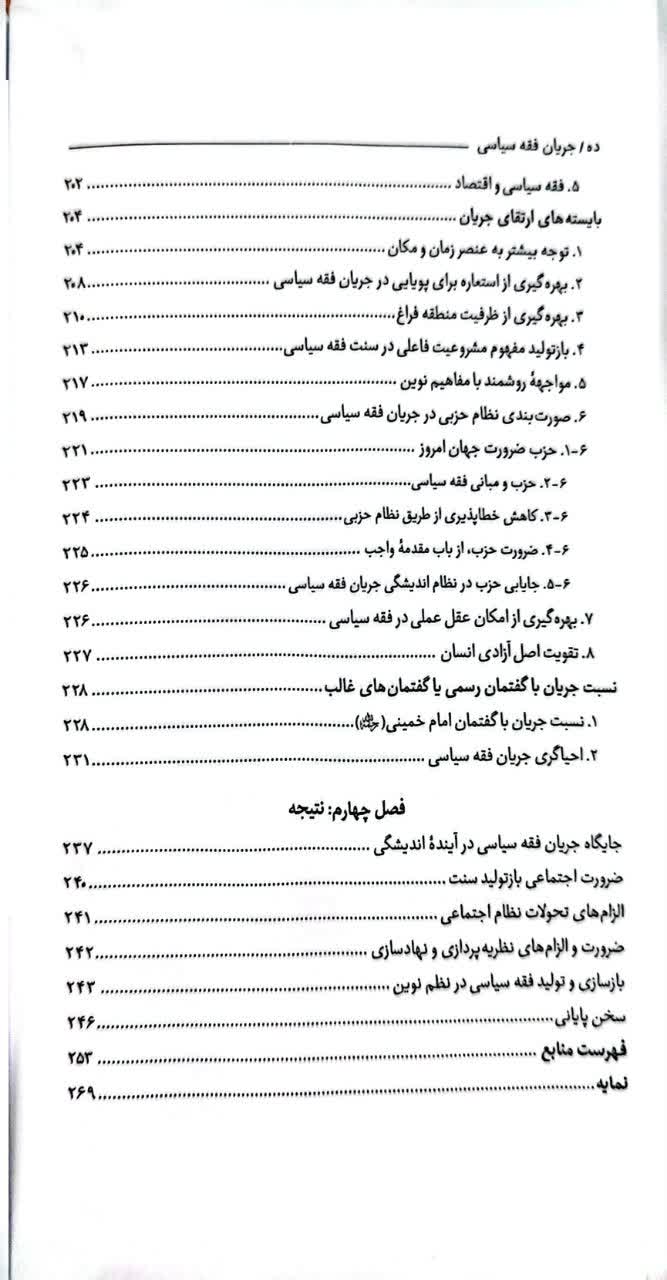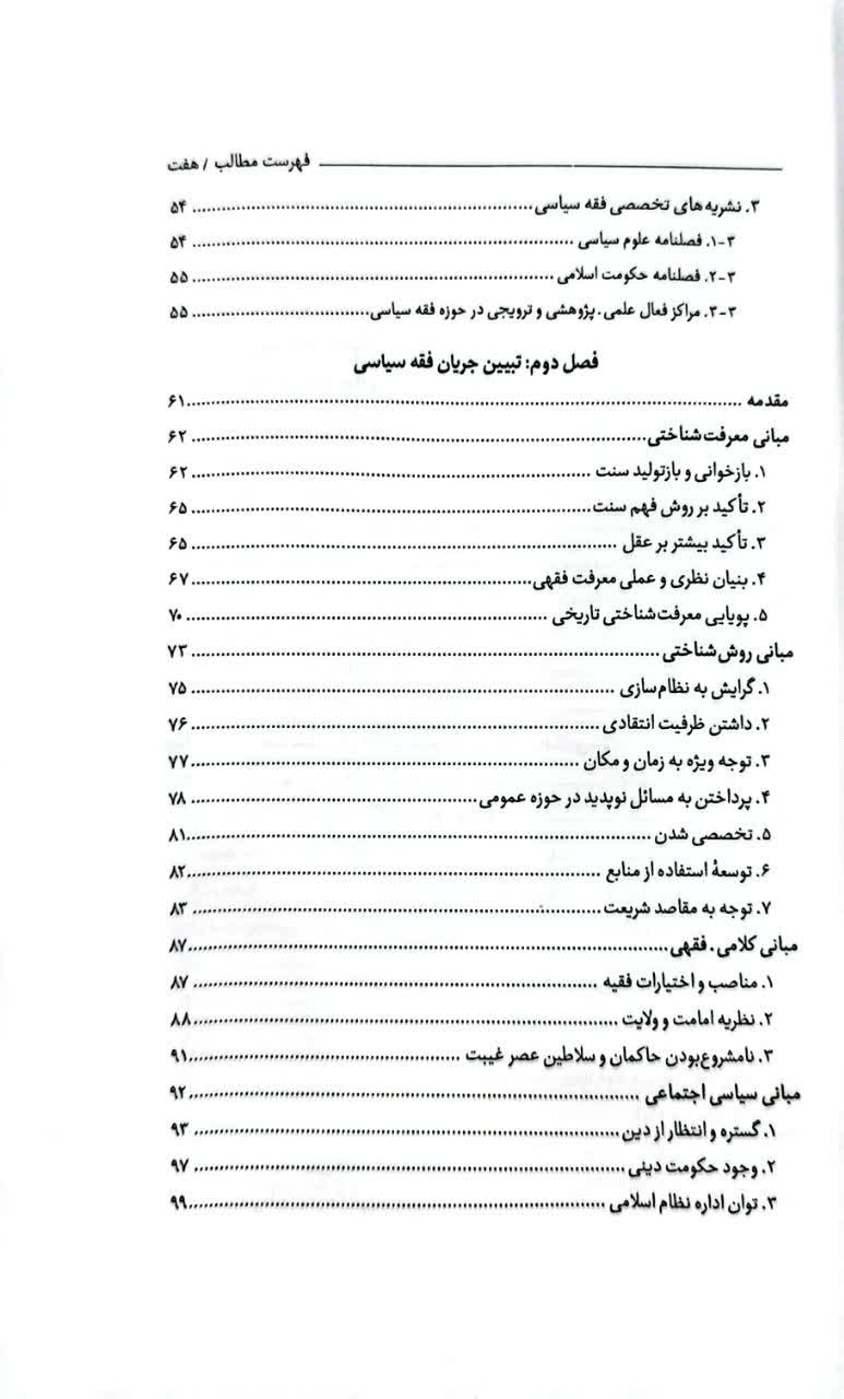 کتاب «جریان فقه سیاسی» به بررسی یکی از مهمترین و تأثیرگذارترین جریانهای فکری-عملی در ایران معاصر میپردازد که ریشه در سنت فقه شیعه دارد و نقش کلیدی در تحولات سیاسی یکصد سال اخیر ایران ایفا کرده است. این جریان با تلفیق دانش فقهی و دغدغههای سیاسی، به تدوین مبانی حکومت دینی و نظامسازی در چارچوب اسلامی پرداخته است. کتاب در قالب سه فصل شامل توصیف جریان (تاریخچه، تبارشناسی، خردهجریانها و شخصیتهای شاخص مانند نایینی، امام خمینی و آیتالله خامنهای)، تبیین جریان (مبانی معرفتشناختی، روششناختی، کلامی و اجتماعی فقه سیاسی) و تحلیل جریان (نقاط قوت و ضعف، نقدهای وارد بر آن و نسبتسنجی با گفتمانهای رقیب) سامان یافته است. همچنین نخستین پژوهش جامع با رویکرد «جریانشناسی» در حوزۀ فقه سیاسی است که به تحلیل تأثیر فقه سیاسی در انقلاب مشروطه و انقلاب اسلامی، بررسی نقش فقه در نظامسازی و نهادسازی حکومت دینی و نقدهای روششناختی و معرفتی به جریان و ارائه راهکارهای ارتقای آن می پردازد. این کتاب نه تنها مرجعی علمی برای شناخت جریان فقه سیاسی است، بلکه با نگاهی تحلیلی به آینده این جریان و نقش آن در نظم نوین سیاسی ایران میپردازد.